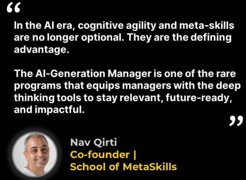 The AI-Generation Manager Program:• is an applied learning cohort-based journey for managers to raise their game and future-proof their careers in the age of AI.• equips you with future-ready and higher-order capabilities, so you do not just keep up with AI, you rise above it.• is tailored for practical, everyday leaders who shoulder the responsibility of turning strategy into reality, guiding teams through change, and driving results under uncertainty.• blends futurist insights, guided instruction, interactive learning, case-based exercises, and a capstone project• ensures that you not only learn new frameworks but also apply them immediately and effectively.