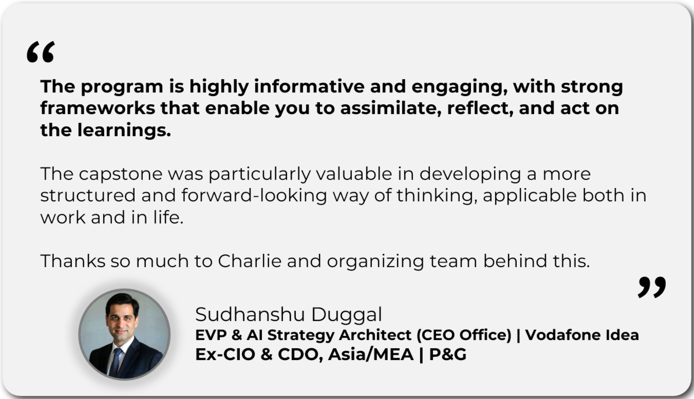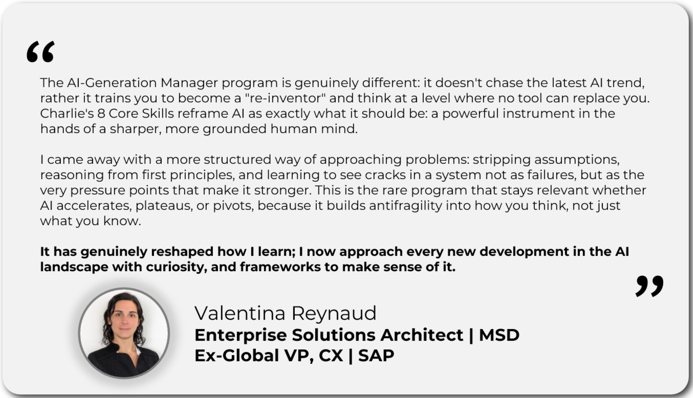 This is a structured capability program specially developed to upskill managers for the shift towards AI-powered environments.AIGM is designed from the ground up for them to acquire advanced cognitive capabilities that AI cannot yet substitute.The program nurtures: